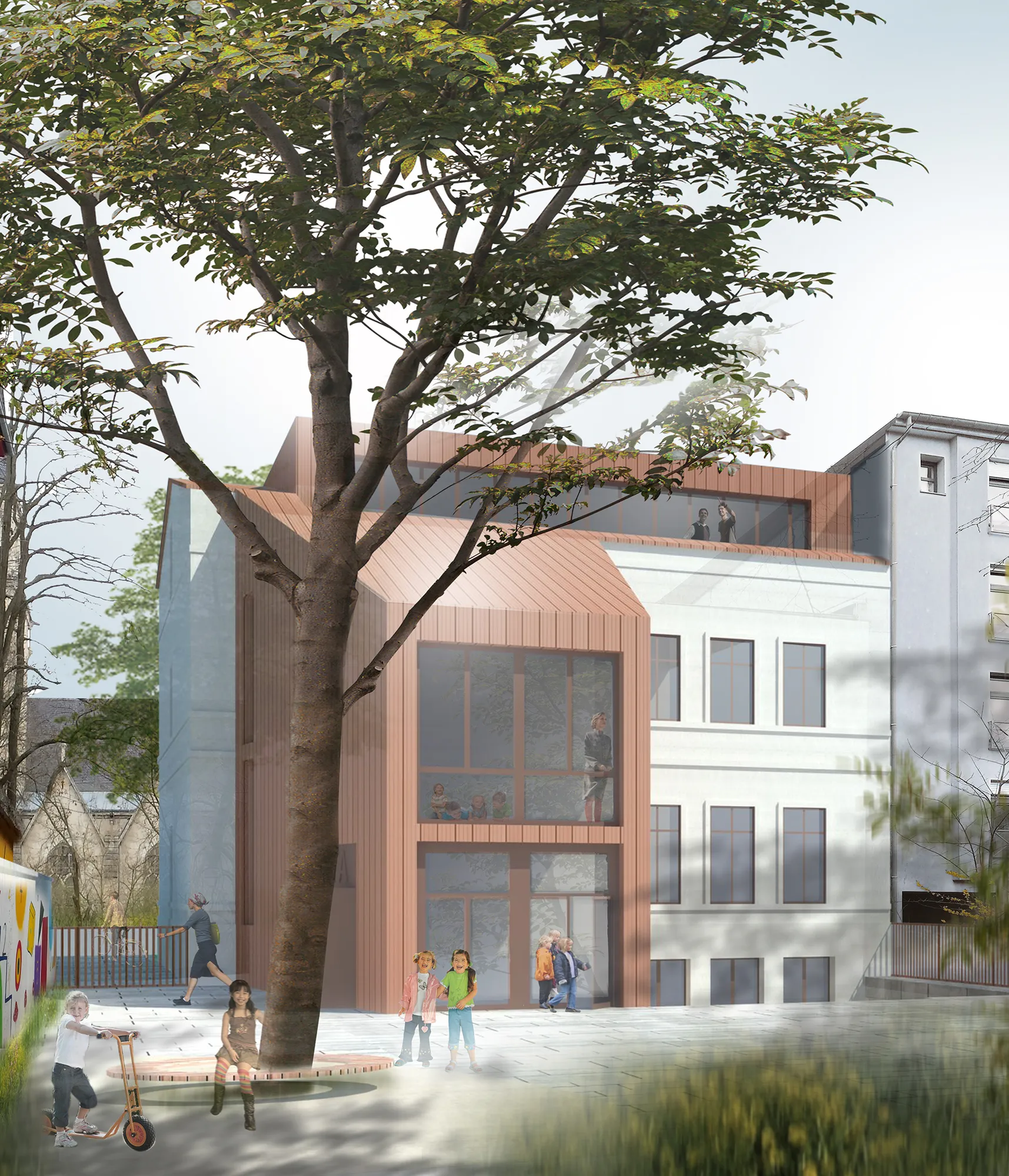 Gestalterisch wird das bestehende Satteldach über den Anbau weitergeführt, um insgesamt eine gestalterische Einheit zu erzielen. Da auch im Grundriss wird das Prinzip der Schrägen aufgegriffen wird, ergibt sich formal ein „Hütchen-Motiv“, das spielerisch die Nutzung des Hauses als komplexe Kindertagesstätte unter einem Dach (Hütchen) versinnbildlicht.
